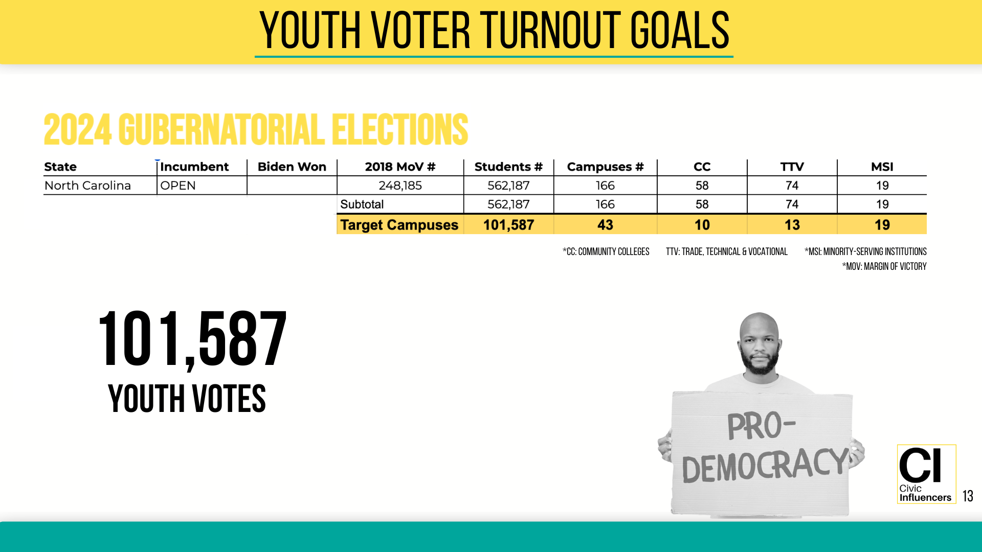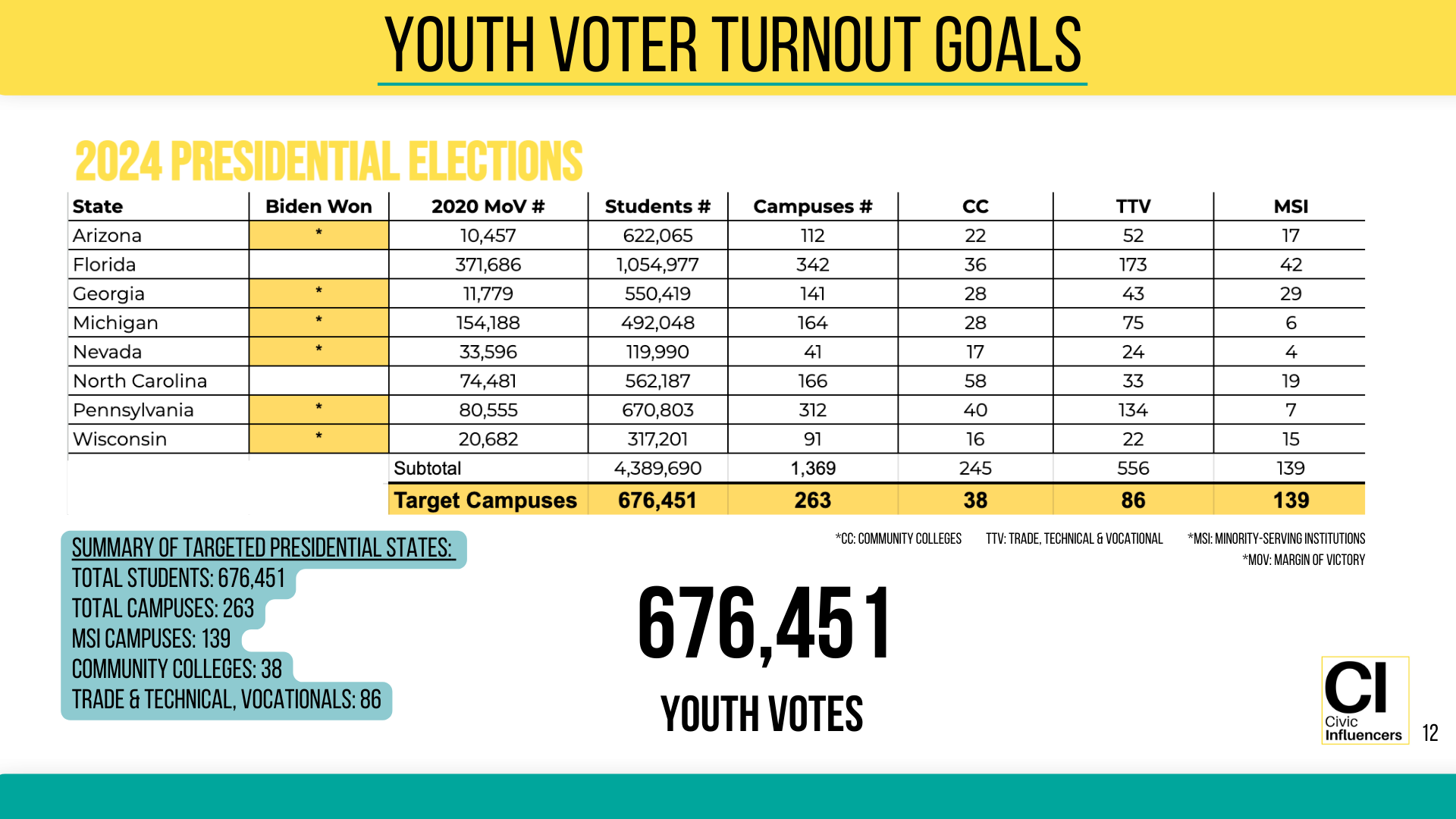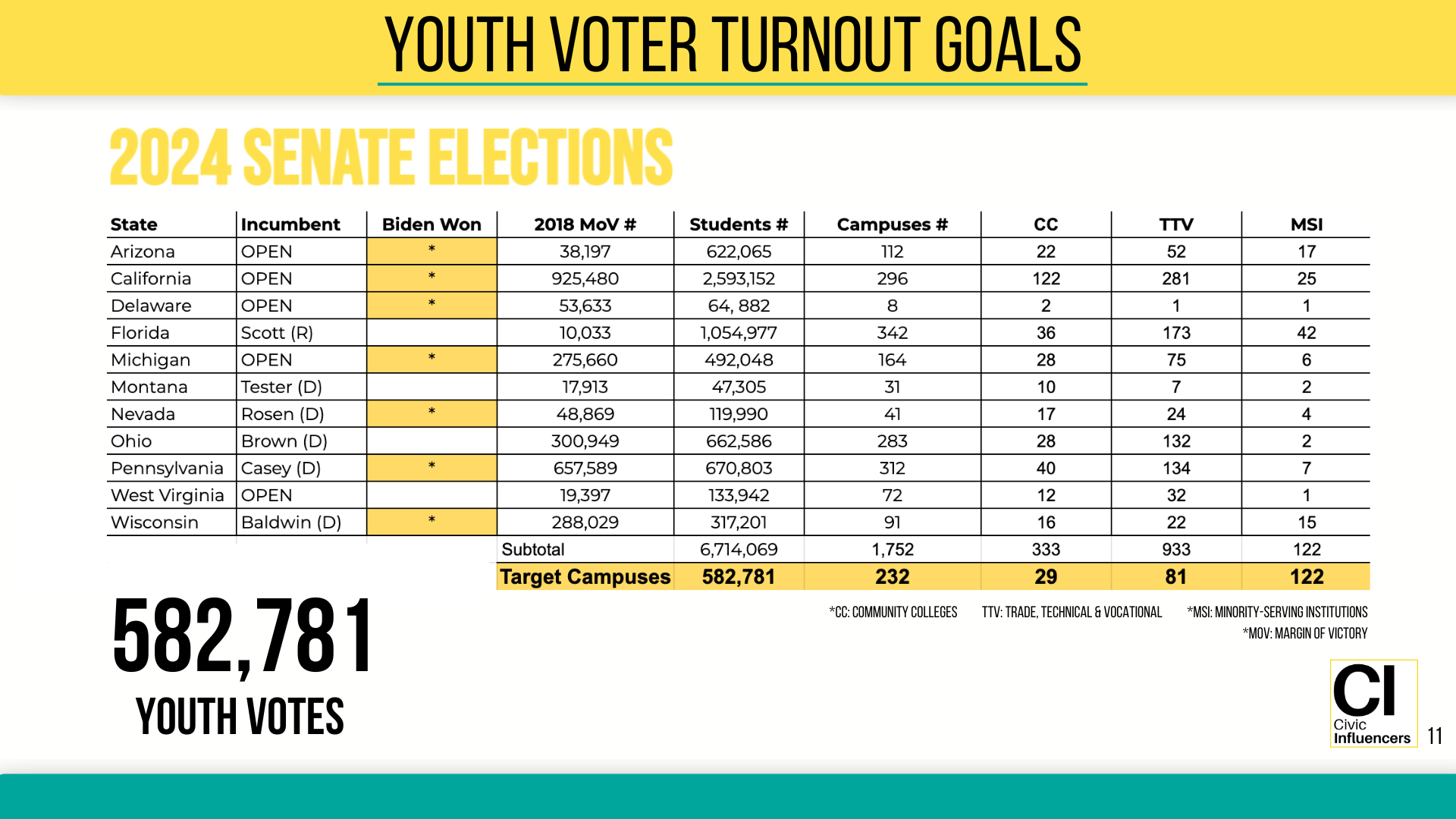 2024 Election: Youth Voter Turnout Goals 2024 Presidential Election 2024 House elections 2024 Senate elections 2024 Gubernatorial elections Donate Today to Invest in Our Data-Driven Youth-Led Organizing! Vote Early • Vote November 5th • Vote Early • Vote November 5th • Vote Early • Vote November 5th •